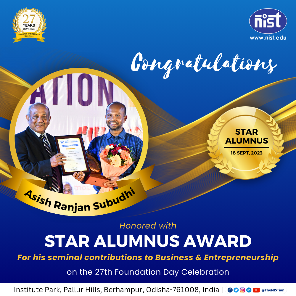 NIST honored Mr. Asish Ranjan Subudhi, a 2000 Graduate in ECE with NIST STAR ALUMNI AWARD 2023. This prestigious recognition celebrates his outstanding contributions to the realms of #Business & #Entrepreneurship. Mr. Asish is a highly qualified technocrat, seasoned IT professional, and agripreneur, boasting an impressive 22-year journey filled with rich and insightful experiences, including over 14 years in international settings spanning the UK, Europe, APAC, MEA, and beyond. As an alumnus of NIST and a member of the inaugural batch that graduated in 2000, Mr. Asish has leveraged his extensive knowledge to standardize and simplify technology interventions and operations, particularly in the context of agriculture, making this sector more accessible and efficient. With his innate communication and leadership skills, combined with a demonstrated aptitude for swiftly grasping and applying new farming concepts, he embarked on the remarkable journey of establishing Bloomenara, a pioneering Agri-tech venture that has grown from the ground up to transform the agricultural landscape. NIST is immensely proud to have Mr. Asish among its esteemed alumni!