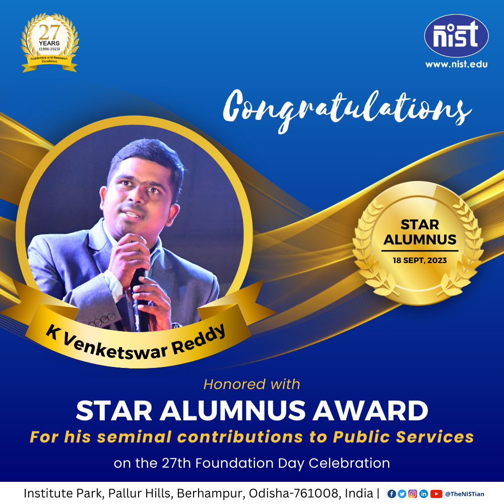 NIST honored Mr. K Venketswar Reddy, a 2011 graduate in CSE with NIST STAR ALUMNI AWARD 2023. This prestigious recognition applauds his outstanding contributions to the field of Public Services. Mr. Reddy achieved the 24th rank in the Odisha Administrative Services (OAS) examination conducted by the Odisha Public Service Commission (OPSC) in 2021. Furthermore, he was bestowed with the Best Officer Trainee Award for his batch from the Gopabandhu Academy of Administration in Bhubaneswar. Currently, Mr. Reddy holds the position of Tahasildar-cum-Executive Magistrate within the Revenue & DM Department of the Government of Odisha, stationed in Bissamcuttack. Prior to this role, he gained experience as a Software Engineer at HCL Technologies Limited in Noida and served as a Manager at the Food Corporation of India in Kurukshetra. NIST takes immense pride in counting Mr. Venketswar among its distinguished alumni!