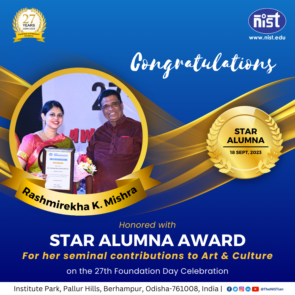 NIST honored Mrs. Rashmirekha Kalyani Mishra, a 2018 graduate in ECE with NIST STAR ALUMNI AWARD 2023. This prestigious accolade celebrates her remarkable contributions to the realm of #Arts & #Culture. Rashmirekha is a gifted artist and poet, having authored three poetry books, two anthologies, and a collection of short stories. Her book, "Filling Feelings," earned her the esteemed India Inspirational Women's Award, presented by none other than Dr. Kiran Bedi. Rashmirekha's literary talent knows no bounds, as evidenced by her inclusion in the Magic Book of Records for crafting an astounding 500 Limericks, each artfully distilled into just 15 words. Her artistic abilities extend beyond words, with some of her artwork showcased in Google Books. Furthermore, her paintings recently gained recognition at the International Art and Sculpture Exhibition - #Tulika, attesting to her global artistic impact. NIST is immensely proud to have Mrs. Rashmirekha Kalyani Mishra among its esteemed alumni!