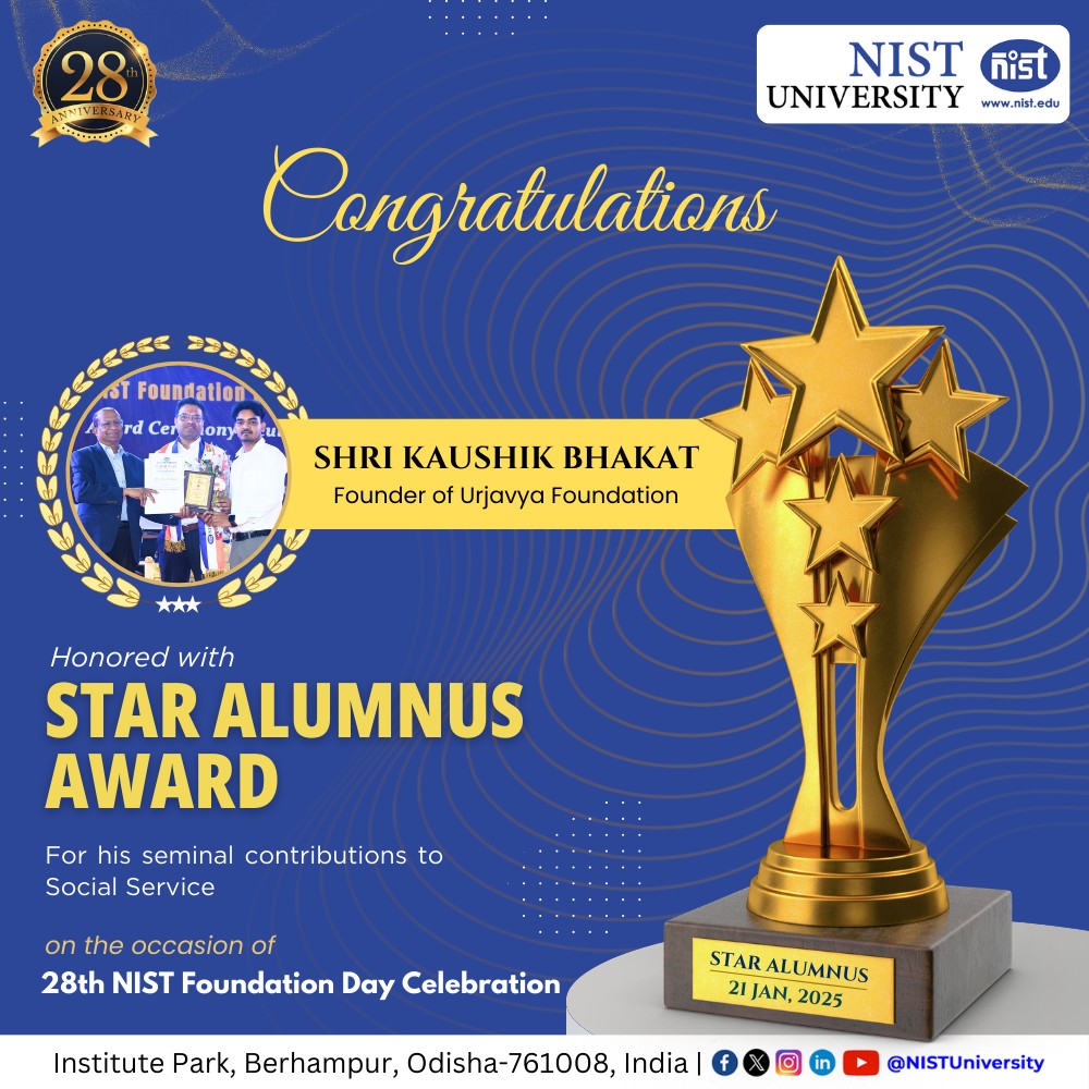 NIST University honors Mr. Kaushik Bhakat with the Prestigious Star Alumni Award in Social Service on its 28th NIST Foundation Day. At NIST University, we take immense pride in celebrating the achievements of our distinguished alumni who are driving positive change in society. Mr. Kaushik Bhakat, the esteemed founder of Urjavya Foundation, has made remarkable contributions to society through his relentless commitment to empowering #tribalcommunities and underprivileged groups. The name Urjavya, derived from Sanskrit, signifies "to empower," perfectly encapsulating the foundation’s mission of fostering sustainable development and improving livelihoods. Headquartered in Kalikapur, Jharkhand, Urjavya Foundation has expanded its impact exponentially, reaching over a hundred households across India. By aligning its initiatives with the United Nations’ Sustainable Development Goals (#SDGs), the organization has received widespread recognition from government bodies for its transparency, ethical approach, and outstanding contributions to social welfare. This prestigious award honors individuals who go above and beyond to uplift marginalized communities, address pressing societal challenges, and create a lasting difference in the lives of those in need. Mr. Bhakat’s unwavering dedication to social service, selflessness, and humanitarian efforts serves as an inspiration to us all. Join us in celebrating his incredible journey and contributions, as we continue to encourage and support alumni who are shaping a better, more inclusive world. Congratulations, Mr. Kaushik Bhakat!