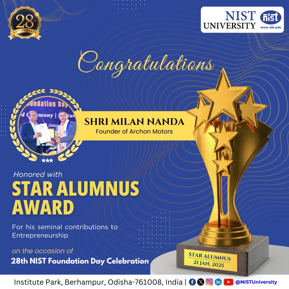 NIST University honors Mr. Milan Nanda with the Star Alumni Award in Entrepreneurship on the special occasion of 28th NIST Foundation Day Celebration. Mr. Nanda is the Founder of Archon Motors, a pioneering electric three-wheeler company dedicated to addressing real-world challenges in sustainable transportation and clean energy. The #staralumniaward in the Category of #Entrepreneurship is a prestigious recognition presented to alumni who have taken bold steps to create new ventures, inspire others, and drive industry growth and #innovation. Each year, NIST University honors three exceptional alumni whose contributions, dedication, and leadership have made a lasting impact on their fields and society. Mr. Nanda's remarkable career journey began as a Brand Manager at Videocon Industries, followed by a significant role at Whirlpool. With 15 years of industry experience, he took the entrepreneurial leap, driven by a deep commitment to Odisha’s #EconomicGrowth, job creation, and positive social change. His venture, Archon Motors, is at the forefront of India’s transition to cleaner, more sustainable mobility solutions. At NIST University, we take immense pride in celebrating the achievements of our alumni, who continue to shine as leaders, innovators, and changemakers in their respective fields. Congratulations to Mr. Milan Nanda for his outstanding contributions, and we look forward to witnessing his continued success in revolutionizing the electric mobility sector!