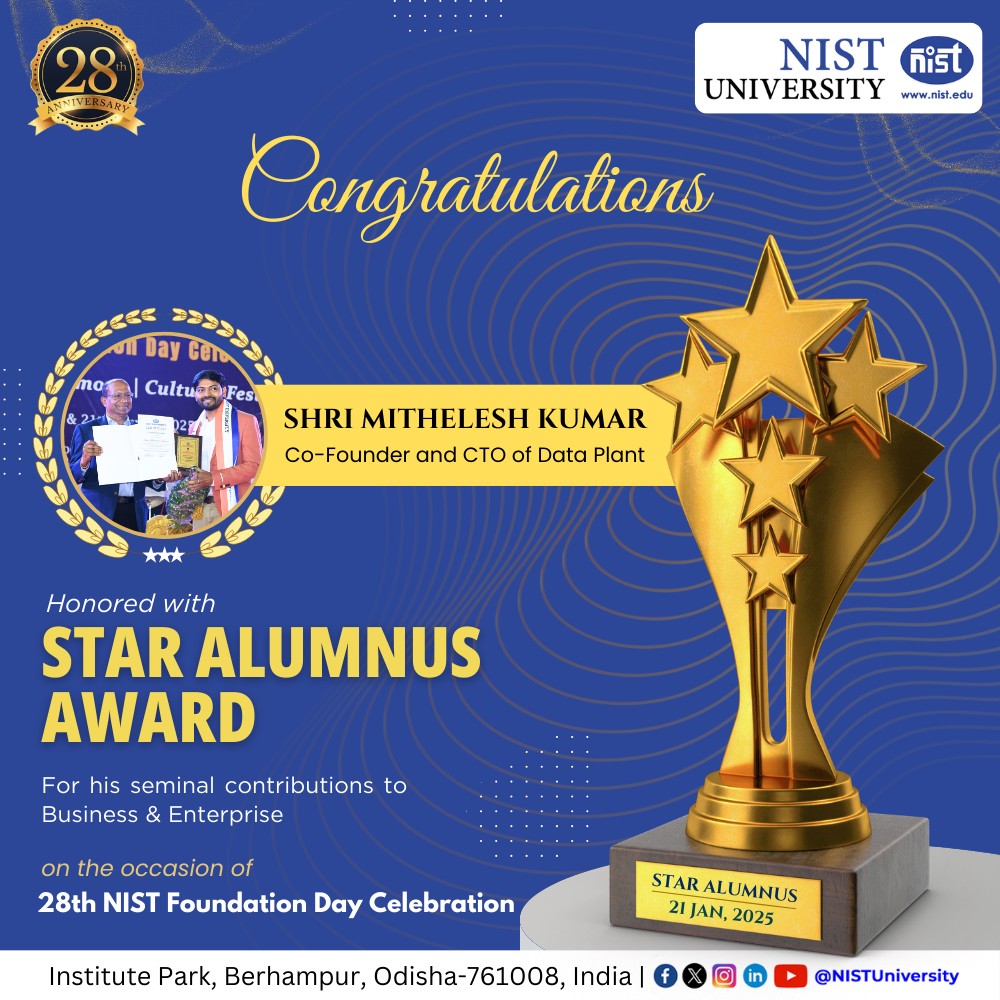 NIST University proudly honors Mr. Mithilesh Kumar, a distinguished graduate of the Class of 2012, with the prestigious Star Alumni Award in the Business & Enterprise category during the 28th NIST Foundation Day celebration. As the Co-Founder and CTO of Data Plant, an enterprise AI product driving industry transformation, Mithilesh has showcased exceptional leadership and innovation. A stellar performer at Wipro, he has consistently demonstrated outstanding skills and expertise. His remarkable achievements include winning the National Level #machinelearning Hackathon on NLP tasks, organized by Springer Nature, and earning recognition as a Top Global Performer at #MATlife. This award celebrates alumni who have made significant contributions to #business, #entrepreneurship, and #innovation, creating a meaningful impact in their organizations and beyond. Each year, NIST University recognizes three exceptional alumni whose dedication, leadership, and achievements leave a lasting mark on their fields and society. Mithilesh Kumar’s journey is a testament to perseverance, excellence, and the power of innovation in AI and machine learning, inspiring countless others. Let's congratulate him.